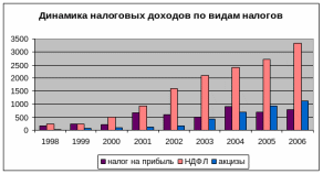 Анализируя график на рис. 3.1.2. можно сделать вывод, что доходы бюджета региона увеличиваются в основном за счет налоговых доходов, то есть за счет налоговых отчислений в бюджет, которые в свою очередь увеличиваются за счет налога на доходы физических лиц, что соответственно, говорит о росте доходов населения республики. Что касается акцизных доходов, то они увеличиваются за счет изменения налогового законодательства в соответствии с политикой государства.