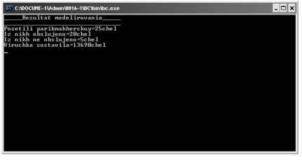 " for(i=0;i 2. Цикл перебора дискретных отсчётов времени периода моделирования: 2.1. Определение числа итераций цикла перебора дискретных отсчётов периода моделирования: "for(j=0;j 2.1.1 .Обработка ухода посетителя парикмахерской: 2. 1.1.1. Определение числа итераций цикла перебора устройств: "for(i=0;i падает с уходом посетителя ton[i]: “if(ton[j]==i)”, и вход в тело цикла “{”, 2.1.1.1.1. освобождение места (парикмахера): “ ton[j]=-1;”; 2. 1.1. 2. 2. увеличение на единицу числа обслуживаемых посетителей: "nPos++"; 2. 1.1.3. Конец цикла 2.1.1.1.: "}". 2.1.2. Обработка прихода нового посетителя: 2. 1.2.1. Поиск первого свободного обрабатывающего устройства: "j=0; while(ton[j]!=-1) j++; 2. 1.2.2. Генерация момента прихода в парикмахерскую нового посетителя и сохранение его в переменной tin: “tin=ceil(RIN)+i;” 2.2. Конец блока цикла 2.1.: "}". 3. Завершение процесса моделирования: 3.1. Вывод результатов моделирования. Разработка программной реализации алгоритма В данном разделе мы разрабатываем программную реализацию имитационного моделирования работы Парикмахерской. Помимо общих переменных, которые были описаны выше в п.2.3., в этом разделе можно описать и частные переменные, которые используются в программе, разработанной на языке программирования С++: В программной реализации используются следующие частные переменные: i, j- используются для хранения вспомогательных индексных значений; t - дискретные отсчёты времени периода моделирования; tin – входящий поток, время прихода посетителя (момент поступления в систему следующего требования); ton [ ] - моменты завершения обработки требований соответствующими элементам массива обрабатывающими устройствами, то есть массив для сохранения интервалов времени ухода посетителей; Cena–цена обслуживания клиента; r– число отказов пользователям; m– число обслуженных посетителей; R-выручка парикмахерской за период моделирования Программная реализация алгоритма производится в несколько этапов: Подключение в программу заголовочных файлов: #include //включение в программу текстов заранее подготовленных файлов #include<iostream.h> //содержит потоки данных ввода/вывода #include<math.h> //хранятся математически функции #include // #include // # include //содержит описания данных #define //определение параметров модели и прочих исходных данных на глобальном уровне, описанной в п. #define RCLIENTS x1[discrete(p1)] float x1[]={7,8,9,10,11,12,13,14,15}; float p1[]={0.05, 0.05, 0.05, 0.2, 0.2, 0.2, 0.05, 0.05, 0.15}; #define CENA x2[discrete(p2)] floatx1[]={10,12,13,14,15,16,17,18,19}; floatp1[]={0.05, 0.05, 0.05, 0.05, 0.05, 0.2, 0.2, 0.2, 0.15}; #defineC (125*125*125*125*5) //объявление мультипликативного конгруэнтного метода, которое описывается в п.1.3. #definen 2// общее число парикмахеров #defineT (8*60*30) // период моделирования (в мин.) Генерация мультипликативным конгруэнтным методом псевдослучайной последовательности чисел: floatrand(void) //генерация псевдослучайной последовательности с равномерным распределением { static unsigned long int u=C; // static – модификатор для того, чтобы локальная переменная u сохраняла значение между двумя последующими обращениями к этой функции u=u*C; //С - константа returnu/float(0xfffffffful); // (0xfffffffful) – максимально беззнаковые целое число, заданное в шестнадцатеричной форме. } Вызов функций моделирования: //функция моделирования показательного распределения, описанная в п.1.7. unsigned int discrete( float p[ ]) { float s, r; int k=0; s=p[ ]; r=rand( ); while (s { k++; s+=s+p[k]; } returnk; } 4. Инициализация unsigned long int i,j,cost, R,r,n,k; float t, tin; m=0; k=0; R=0; 5. Запускпрограммы tin=RIN; for(i=0;i 6. Обработказавершения for(j=0;j { m++; ton[j]=-1; } 7. Обрабо
