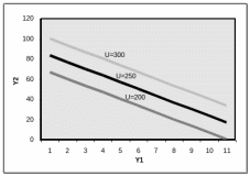 Если обозначить через U = U(y1, y2) функцию, или, иначе говоря, индекс полезности, которую можно получить от потребления благ, заданных вектором (y1, y2), то кривая безразличия это набор значений
