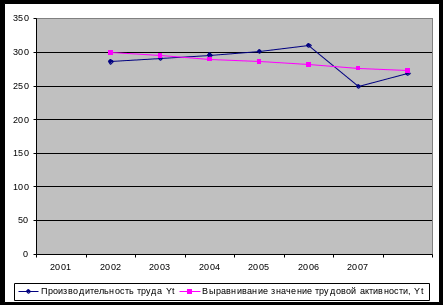 Распределение координатных значений на графике подтверждает, что производительность труда имеет тенденцию снижения (b<0), причем ежегодно с 2001 по 2007 года оно снижалась в среднем на 4,4275 тыс. руб. (b=4,4275).