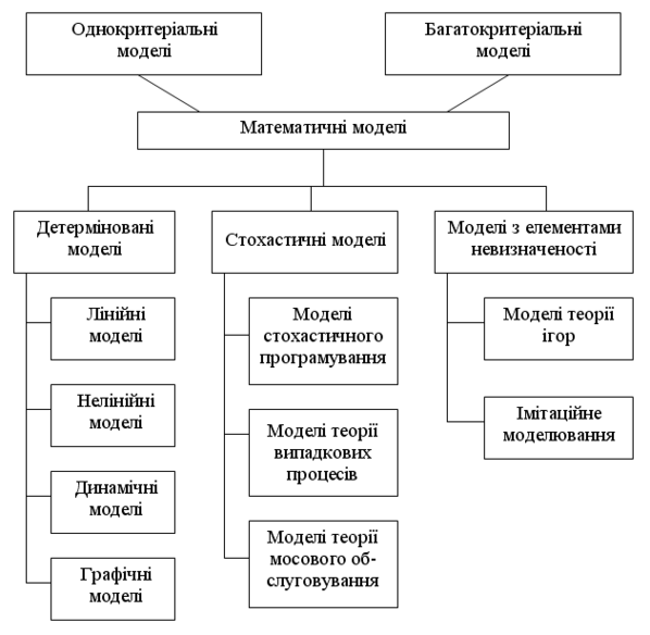 В імітаційних моделях реальний процес розвертається в машинному часі, і простежуються результати випадкових впливів на нього, наприклад організація виробничого процесу. У детермінованих моделях невідомі фактори не враховуються. Незважаючи на гадану простоту цих моделей, до них зводяться багато практичних задач, у тому числі більшість економічних задач. По виду цільової функції й обмежень детерміновані моделі діляться на лінійні, нелінійні, динамічні й графічні.