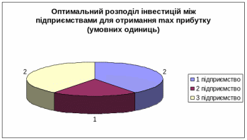 Практичний аналіз динамічного програмування розглядався на прикладі оптимального розподілу інвестицій між підприємствами, мета розподілу полягала у максимізації загального прибутку від інвестування. У результаті практичної реалізації було встановлено, що для отримання максимального прибутку у розмірі 6400 умовних одиниць, необхідно по 2000 умовні одиниці вкласти в перше і третє підприємства і 1000 умовну одиницю – у друге підприємство. Необхідно зазначити, що отримане рішення є лише деяким наближенням до оптимального рішення. Його можна покращити, тобто приблизити до оптимального, взявши менший крок оптимізації, наприклад вкладати у підприємства кошти, кратні 500 умовним одиницям, а отже існує широкий простір для подальшої і більш глибокої роботи.