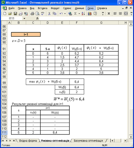 Проведення умовної оптимізації для першого підприємства за умови вкладання 5000 умовних одиниць