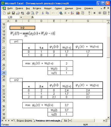 Проведення умовної оптимізації для другого підприємства за умови вкладання 1000 і 2000 умовних одиниць