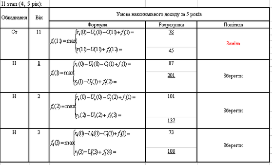 Друга гіпотеза: до N-ому року встаткування могло прийти заміненим у якомусь році, тоді складається пара рівнянь, у яких визначається доход за рік від експлуатації одиниці встаткування за умови заміни або збереження встаткування.