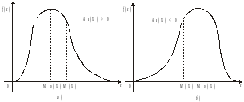 Функція щільності розподілу ймовірності у випадках додатного (а) та від`ємного (б) коефіцієнтів асиметрії