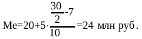 интервал 20–25 млн. руб., так как его частота максимальна (f3 = 10). Расчет моды по формуле (3):