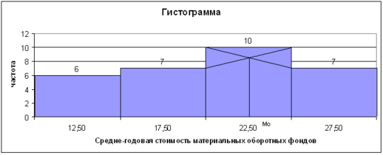 Вывод. Для рассматриваемой совокупности предприятий наиболее распространенная среднегодовая стоимость материальных оборотных фондов характеризуется средней величиной 12,5 млн руб.
