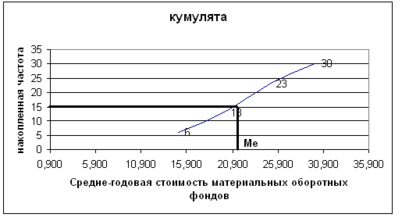 =20,5 млн руб., Мо=22,5 млн руб., Ме=24 руб.), что подтверждает вывод об однородности совокупности предприятий. Таким образом, найденное среднее значение среднегодовой стоимости материальных оборотных фондов предприятий (20,5 млн руб.) является типичной, надежной характеристикой исследуемой совокупности предприятий.