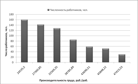 На основании гистограммы можно сделать вывод, что большая часть работников ОАО «Бумажная Фабрика «Коммунар» имеет среднемесячную производительность труда в пределах от 24535,5 до 32569,35 руб./раб.