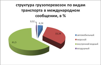 По данным таблицы 7 видно, что наибольший удельный вес в общем количестве грузоперевозок по видам транспорта общего пользования в международном сообщении занимает внутренний водных транспорт. В 2007 году его доля была самой большой и составила 71,27%. Наименьший удельный вес по грузоперевозкам отводится воздушному транспорту, в 2006 году его доля была меньше всех остальных видов транспорта и составляла 0,61%.