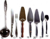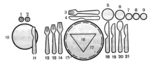1. Перечница.2. Солонка.3. Вилка десертная.4. Нож десертный.5. Фужер.6. Бокал для шампанского.7. Рюмка для красного вина.8. Рюмка для белого вина.9. Рюмка для водки.10. Тарелка пирожковая.11. Нож для масла. | 12. Вилка закусочная.13. Вилка рыбная.14. Вилка столовая.15. Тарелка подстановочная.16. Салфетка полотняная.17. Тарелка мелкая (закусочная).18. Нож столовый.19. Нож рыбный.20. Ложка столовая.21. Нож закусочный. |