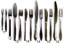 На подстановочные тарелки ставят закусочные, а слева в 10-15 см на расстоянии 8-10 см от края стола - пирожковые. Затем в порядке очередности использования раскладывают приборы. Справа кладут ножи лезвием к тарелке, слева - вилки зубцами вверх (ближе к подстановочной тарелке вилку и нож для мясного блюда, рядом - для рыбного блюда и с края - закусочные). Если в меню включено первое блюдо, то справа между закусочным и рыбным ножами кладут бульонную (десертную) ложку углублением вверх.