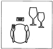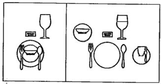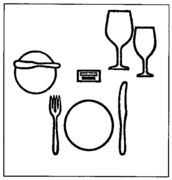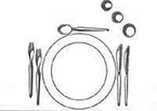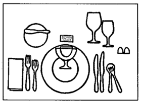 Суповая тарелка и глубокая тарелка стоят на блюде-подставке. Слева рядом, чуть выше вилок – тарелка для хлеба. Столовые приборы расположены следующим образом: суповая ложка – справа рядом с ножом для рыбы, вилка для рыбы лежит по левому внешнему краю, для главного блюда около тарелки лежат соответствующие вилка и нож. Маленький нож для сливочного масла и закусок лежит на пирожковой тарелке. Десертные приборы лежат над тарелками: вилка – черенком влево, ложка – черенком вправо. Бокалы ставят в следующей последовательности от суповой ложки справа и вверх: для белого вина под закуски, бокал для воды и бокал для красного вина к основному блюду.