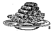 Рисунок N3 изображает сервировку блинчатых пирожков, рисовых и прочих крокет к супу, щам и борщу. На меньшее количество персон можно уложить их на меньшее блюдо и в один ряд.