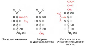 К типичным гликопротеинам относят большинство белковых гормонов, секретируемые в жидкие среды организма вещества, мембранные сложные белки, все антитела (иммуноглобулины), белки плазмы крови, молока, овальбумин, интерфероны, факторы комплемента, группы крови, рецеп-торные белки и др. Из этого далеко не полного перечня гликопротеинов видно, что все они выполняют специфические функции: обеспечивают клеточную адгезию, молекулярное и клеточное узнавание, антигенную активность опухолевых клеток, оказывают защитное и гормональное, а также антивирусное действие.