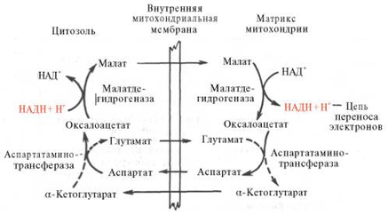 Установлено, что от цитозольного НАДН + Н+ восстановленные эквиваленты сначала при участии фермента малатдегидрогеназы (рис. 5) переносятся на цитозольный оксалоацетат. В результате образуется малат, который с помощью системы, транспортирующей дикарбоновые кислоты, проходит через внутреннюю мембрану митохондрии в матрикс. Здесь малат окисляется в оксалоацетат, а матриксный НАД+ восстанавливается в НАДН + Н+, который может теперь передавать свои электроны в цепь дыхательных ферментов, локализованную на внутренней мембране митохондрии. В свою очередь образовавшийся оксалоацетат в присутствии глутамата и фермента АсАТ вступает в реакцию трансаминирования. Образующиеся аспарат и α-кетоглутарат с помощью специальных транспортных систем способны проходить через мембрану митохондрий.