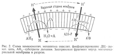 , выделяющаяся при движении протонов внутрь митохондрий по электрич. полю в сторону меньшей их концентрации (рис. 2, процесс 2), используется АТФ-синтетазой для синтеза АТФ. Т. обр., схему О.ф., согласно этой концепции, можно представить в след. виде: