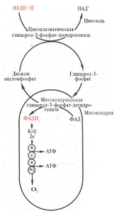 Образовавшийся глицерол-3-фосфат легко проникает через митохонд-риальную мембрану. Внутри митохондрии другая (митохондриальная) глицерол-3-фосфат-дегидрогеназа (флавиновый фермент) снова окисляет глицерол-3-фосфат до диоксиацетонфосфата: