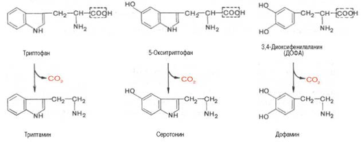 Далее представлены отдельные примеры декарбоксилирования аминокислот, в частности тех, продукты реакции которых оказывают сильное фармакологическое действие. Одним из хорошо изученных ферментов является декарбоксилаза ароматических аминокислот. Она не обладает строгой субстратной специфичностью и катализирует декарбок-силирование L-изомеров триптофана, 5-окситриптофана и 3,4-диоксифе-нилаланина (ДОФА); продуктами реакций, помимо СО2, являются соответственно триптамин, серотонин и диоксифенилэтиламин (дофамин).