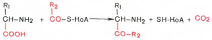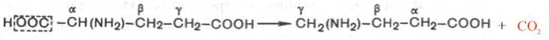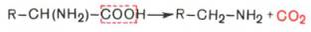 1. α-Декарбоксилирование, характерное для тканей животных, при котором от аминокислот отщепляется карбоксильная группа, стоящая по соседству с α-углеродным атомом. Продуктами реакции являются СО2 и биогенные амины: