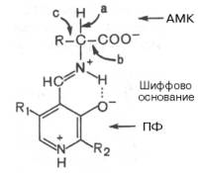 Образование подобного комплекса в сочетании с некоторым оттягиванием электронов белковой частью молекулы фермента сопровождается лабилизацией одной из трех связей при α-углеродном атоме, благодаря чему аминокислота способна вступать в реакции трансаминирования (а), декарбоксилирования (b) и альдольного расщепления (с).
