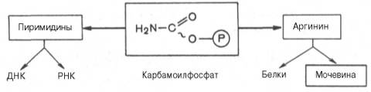 Таким образом, весь цикл мочевинообразования может быть представлен следующим образом. На первом этапе синтезируется макроэрги-ческое соединение карбамоилфосфат – метаболически активная форма аммиака, используемая в качестве исходного продукта для синтеза пи-римидиновых нуклеотидов (соответственно ДНК и РНК) и аргинина (соответственно белка и мочевины):