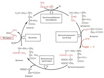 Рис. 6. Орнитиновый цикл синтеза мочевины в печени.