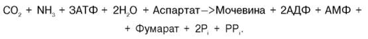 На синтез одной молекулы мочевины требуется затрата четырех высокоэнергетических фосфатных групп: две молекулы АТФ расходуются на синтез карбамоилфосфата и одна – на образование аргининоянтарной кислоты, при этом АТФ расщепляется на АМФ и РРi, который при гидролизе также образует две молекулы Рi.