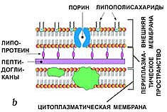 у бактерий со вторым типом строения клеточной стенки поверх 2—3 слоев пептидогликана муреина располагается слой липополисахаридов. Эти бактерии при окраске по методу Грама неспособны прочно удерживать комплекс генцианового фиолетового и йода и соответственно обесцвечиваются спиртом, прокрашиваясь дополнительным красителем — фуксином — в розово-красный цвет. Они называются грамотрицательными.