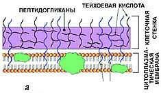 Муреиновый мешок выполняет функцию опорного каркаса клеточной стенки. На нем откладываются и его инкрустируют различные другие вещества. По строению этого каркаса, а также по содержанию других веществ в клеточной стенке грам-положительные бактерии отличаются от грам-отрицательных.