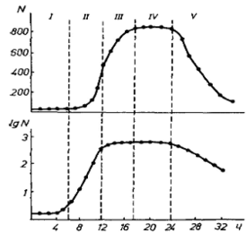 Рис. 1. Фазы роста культуры микроорганизмов: I — лаг-фаза, II — логарифмическая фаза, III — фаза замедленного роста, IV — стационарная фаза, V —фаза отмирания, N — число клеток (млн/мл)