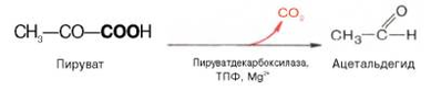 В дрожжевых клетках (спиртовое брожение) пируват вначале подвергается декарбоксилированию, в результате чего образуется ацетальдегид. Данная реакция катализируется ферментом пируватдекарбоксилазой, который требует наличия ионов Mg и кофермента (ТПФ):