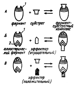 Аллостерические ферменты имеют каталитический и регуляторный (аллостерический) центры, пространственно разобщенные, но функционально тесно взаимосвязанные. Каталитическая активность фермента меняется в результате связывания с его регуляторным центром определенных метаболитов, называемых эффекторами. Кроме конечных продуктов данного пути, эффекторами могут быть субстраты ферментов, а также некоторые конечные продукты родственных метаболических путей. Если действие эффектора приводит к понижению каталитической активности фермента, такой эффектор называется отрицательным, или ингибитором. Положительным называют эффектор, действие которого повышает каталитическую активность фермента. Положительным эффектором, или активатором, чаще всего бывает субстрат данного фермента.