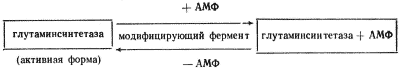 Наконец, активность некоторых ферментов регулируется путем химической модификации их молекулы, в основе которой лежит ковалентное обратимое связывание с ферментом определенной группировки, что приводит к изменению его активности. У прокариот известны две ферментные системы, активность которых регулируется таким путем. Глутаминсинтетаза E. coli, катализирующая синтез глутамина, существует в двух формах, различающихся присутствием в одной из них остатка адениловой кислоты. Присоединение его с помощью ковалентной связи, катализируемое соответствующим модифицирующим ферментом, приводит к образованию менее активной аденилированной глутаминсинтетазы: