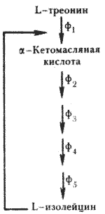Наиболее простой случай аллостерической регуляции — регуляция первого фермента неразветвленного биосинтетического пути его конечным продуктом. Если конечный продукт накапливается в избытке, он подавляет активность первого фермента в процессе, называемом ингибированием по принципу обратной связи Примером такого типа регулирования является ингибирование биосинтеза L-изолейцина (рис. 30) Первый фермент на пути синтеза L-изолейцина L-треониндезаминаза является аллостерическим и ингибируется только L-изолейцином.