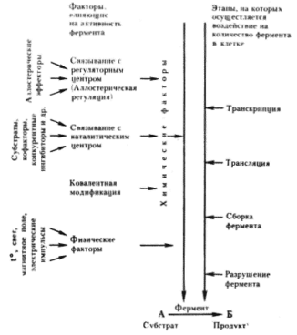 Поскольку практически все реакции в клетке катализируются ферментами, регуляция метаболизма сводится к регуляции интенсивности ферментативных реакций. Скорость последних может регулироваться двумя основными способами: путем изменения количества ферментов и/или изменения их активности, т. с. степени испольвания их каталитического потенциала.