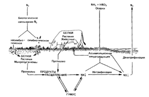 Круговорот азота (рис. 1.2). Центральное место в круговороте азота занимает аммоний. Он является продуктом разложения белков и аминокислот, попадающих вместе с остатками животного и растительного происхождения в почву. В хорошо аэрируемых почвах аммоний подвергается нитрификации; бактерии родов Nitrosomonas и Nitrobacter окис ляют его до нитрита и нитрата. В качестве источника азота растения могут использовать и ассимилировать как аммоний, так и нитрат. В отсутствие кислорода из нитрата рбразуется молекулярный азот (денитри-фикация). Бактерии, участвующие в этом процессе, используют при этом нитрат в качестве окислителя (акцептора водорода), т.е. «дышат» с помощью NO^ вместо 02; в этом случае говорят о «нитратном дыхании». Денитрификация ведет к потере азота почвой. Наряду с этим бактерии способны и к фиксации молекулярного азота. Связывающие азот бактерии живут или свободно в почве (вне симбиоза), или в симбиозе с высшими растениями (симбиотические азотфиксаторы). Основную роль в круговороте азота наряду с животными и растениями играют бактерии.