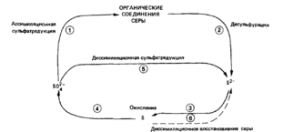 Круговорот серы (рис. 1.3). В живых клетках сера представлена главным образом сульфгидрильными группами в серусодержащих аминокислотах (цистеин, метионин, гомоцистеин). В сухом веществе организмов доля серы составляет 1%. При анаэробном разложении органических веществ сульфгидрильные группы отщепляются десульфуразами; образование сероводорода при минерализации в анаэробных условиях называют также десульфурированием. Наибольшие количества встречающегося в природе сероводорода образуются, однако, при диссими-ляционном восстановлении сульфатов, осуществляемом сульфатредуци-рующими бактериями.