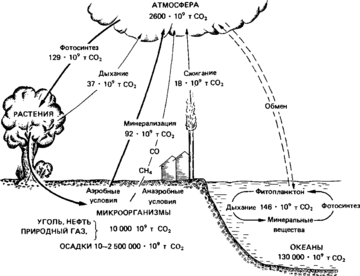 Зеленым растениям пришлось бы вскоре прекратить фиксацию С02, если бы низшие животные и микроорганизмы не обеспечивали возвращение этого газа в атмосферу в результате непрерывной минерализации органического материала. В общем балансе веществ на земном шаре почвенным бактериям и грибам принадлежит не меньшая роль, чем фо-тосинтезирующим зеленым растениям. Взаимозависимость всех живых существ на Земле находит наиболее яркое выражение в круговороте углерода.
