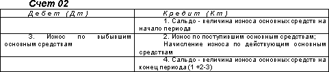Учет накопленного износа по основным средствам ведется на счете 02 «Износ основных средств», по кредиту которого записывается сумма ежегодных амортизационных начислений, а по дебету — накопленный износ реализованных, ликвидированных или иным образом выбывших основных средств.