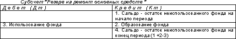 Организации могут создавать ремонтный фонд для накапливания средств на осуществление ремонтных работ, особенно в организациях с сезонным производством. Для учета ремонтного фонда открывается субсчет «Резерв на ремонт основных средств» к счету 96 «Резервы предстоящих расходов».
