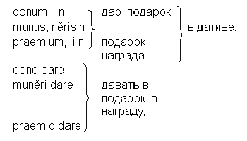 Dat+vus finlis часто употребляется в сочетании с dativus commOdi (cм. Лекцию 1), образуя конструкцию dat+vus duplex ("двойной дательный падеж"): amicO auxiliO ven+re приходить на помощь другу (где amicO - dat+vus commOdi, auxiliO - dat+vus finlis).