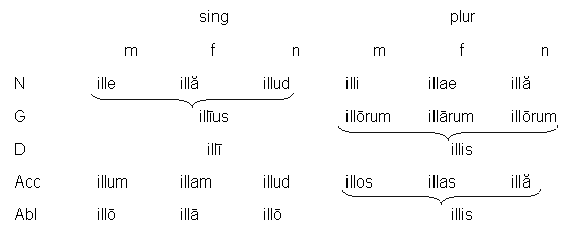 Местоимение iste и ipse склоняется как ille (но у ipse, ipsa, ipsum N. sing. и Acc. sing. имеют обычное -m в конце слова). У этих местоимений звук - + в окончании G. sing. долгий (несмотря на то, что после него идет гласный звук) и, следовательно, ударный: ist+um и т.д.