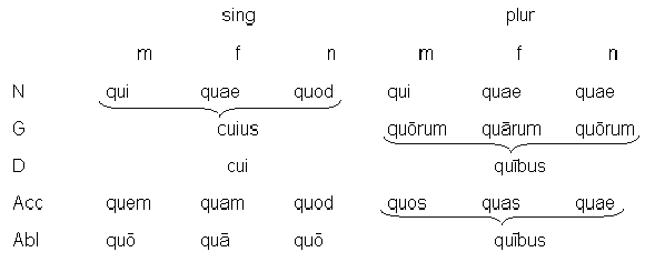 При склонении вопросительных и относительных местоимений проявляются особенности местоименного склонения. Quis? quid? склоняются как qui, quae, quod. Acc. sing. среднего рода - quid.