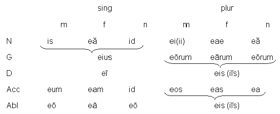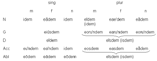 У местоимения idem, eadem, idem склоняется первая часть; конечная часть -dem прибавляется без изменений. В G. sing. местоимения idem, eadem, idem, а также is, ea, id и hic, haec, hoc -i- попадает в положение между гласными (т.е. в начало слога), и поэтому читается как [й]: eius [эйус] и т.д.