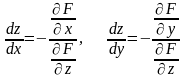 Аналогічно частинні похідні ф-ії двох незалежних змінних z=f(x;y), яка задана за допомогою рівняння F(x;y;z)=0 де F(x;y;z) – диференційовна ф-ія змінних x,y,z, можуть бути обчислені за формулами: