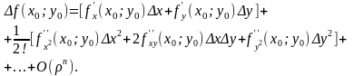 Розглянемо ф-ію двох змінних z=f(x;y). Припустимо, що в околу заданої точки (x0;y0) ця ф-ія має неперервні похідні всіх порядків, до n+1 включно. Надамо x0 і y0 деякі прирости x і y так, щоб прямолінійний відрізок, який з’єднує точки (x0;y0) і (x0+x;y0+y), не вийшов за межі околу, що розглядається. Тоді формула Тейлора: