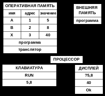 PRINT — оператор вывода значений переменных на экран; процессор считывает значение переменной (X) из памяти и высвечивает это значение (40) на экране дисплея.