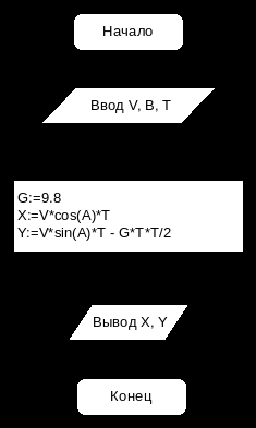 Следующим этапом является построение информационной модели и алгоритма. Здесь необходимо четко зафиксировать, какие величины являются аргументами и какие — результатами алгоритма, а также определить тип этих величин. В нашем случае аргументами являются следующие переменные: угол вылета снаряд а А, его начальная скорость V и время полета Г. Результатом являются координаты Х и Y. Все они являются переменными